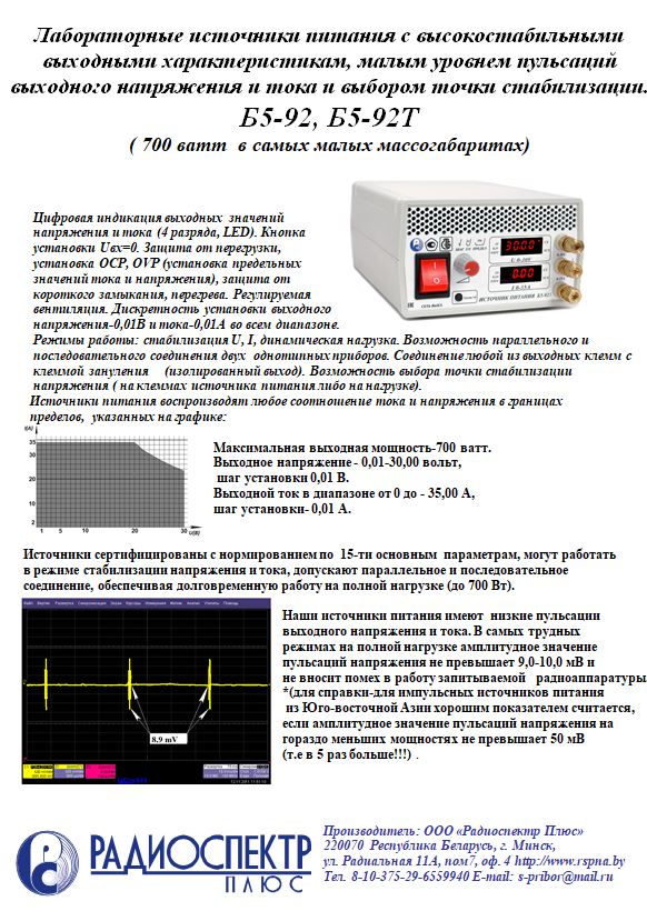Цифровая индикация выходных значений напряжения и тока (4 разряда, LED). Кнопка установки Uвх=0. Защита от перегрузки, установка ОСР, OVP (установка предельных значений тока и напряжения), защита от короткого замыкания, перегрева. Регулируемая вентиляция. Дискретность установки выходного напряжения-0,01В и тока-0,01А во всем диапазоне. Режимы работы: стабилизация U, I, динамическая нагрузка. Возможность параллельного и последовательного соединения двух однотипных приборов. Соединение любой из клемм с клеммой зануления (изолированный выход). Модель Б5-92Т имеет возможность переноса точки стабилизации напряжения с выходных клемм прибора на клеммы нагрузки.
